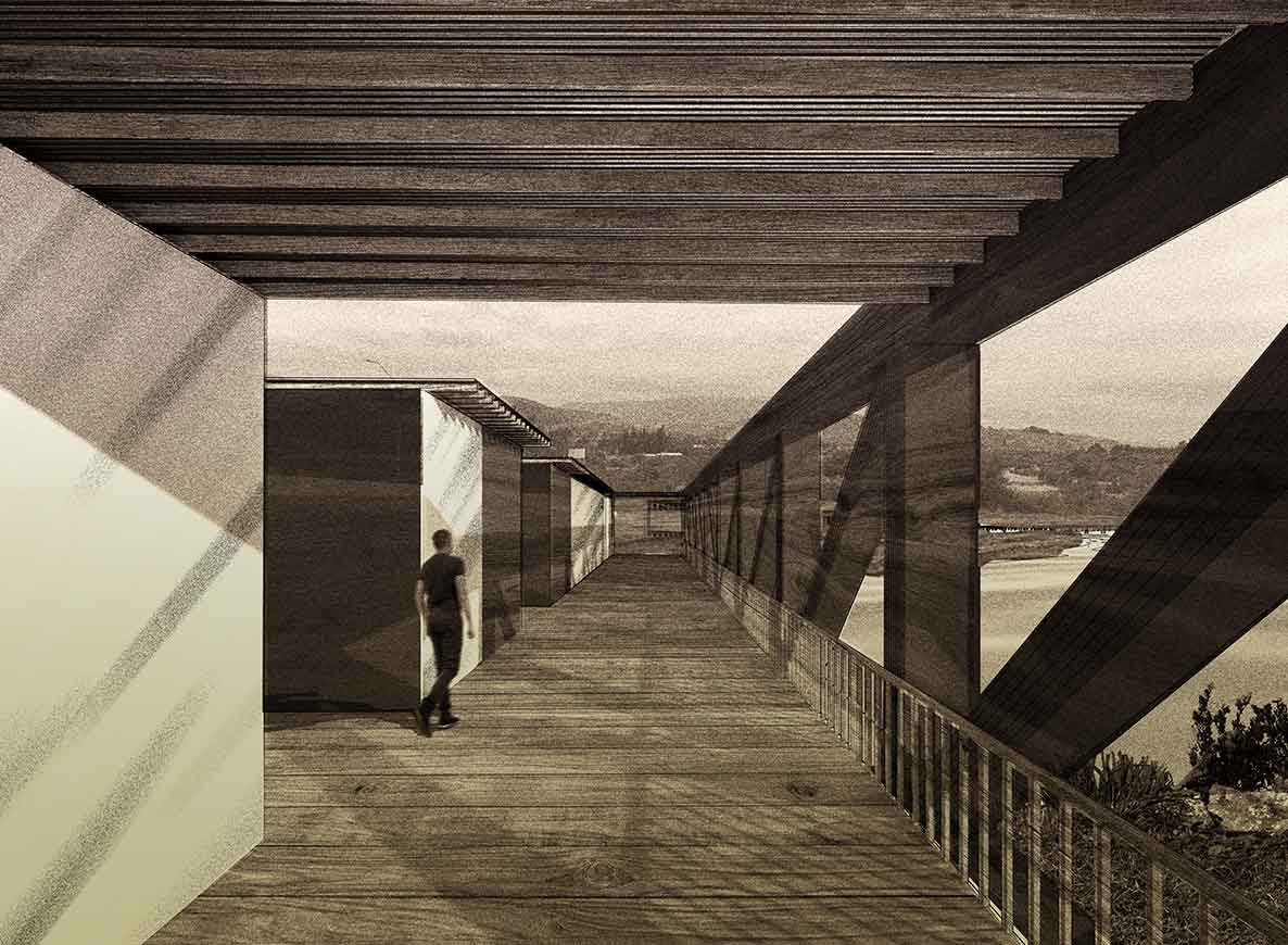 This project addresses flood risk along the Huasco River edge through the creation of a water park and a system of pavilions and walkways over wetlands, conceived as flexible structures capable of absorbing and redirecting water during flood events. The proposal functions as an ecological infrastructure that combines research, risk mitigation, and accessible public spaces. Elevated paths, a visitor center, and research pavilions support scientific study and environmental education while connecting the city with the fluvial ecosystem, fostering a resilient relationship between nature, knowledge, and community.